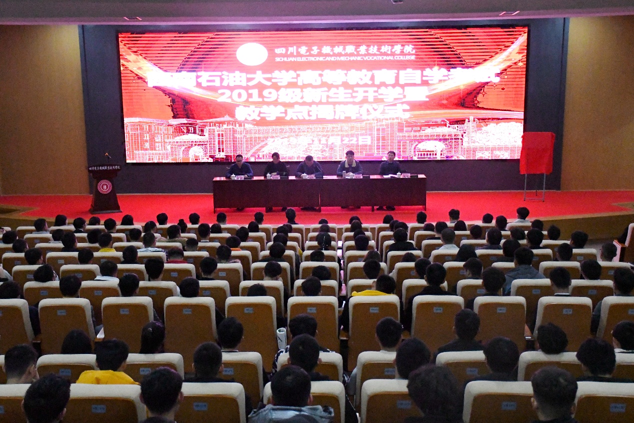 2019年11月22日下午4:30,我校高等教育自學考試四川電子機械職業技術學院教學點揭牌暨2019級新生開學儀式在四川電子機械職業技術學院學術報告廳隆重舉行。院長湯富榮、副院長阮雪梅,四川電子機械職業技術學院副院長黃藝、院長助理、教務處長熊峰、繼續教育處長趙勛出席了本次儀式,我校自考學習服務中心的老師以及近400名2019級自考專升本新生參加了本次活動。