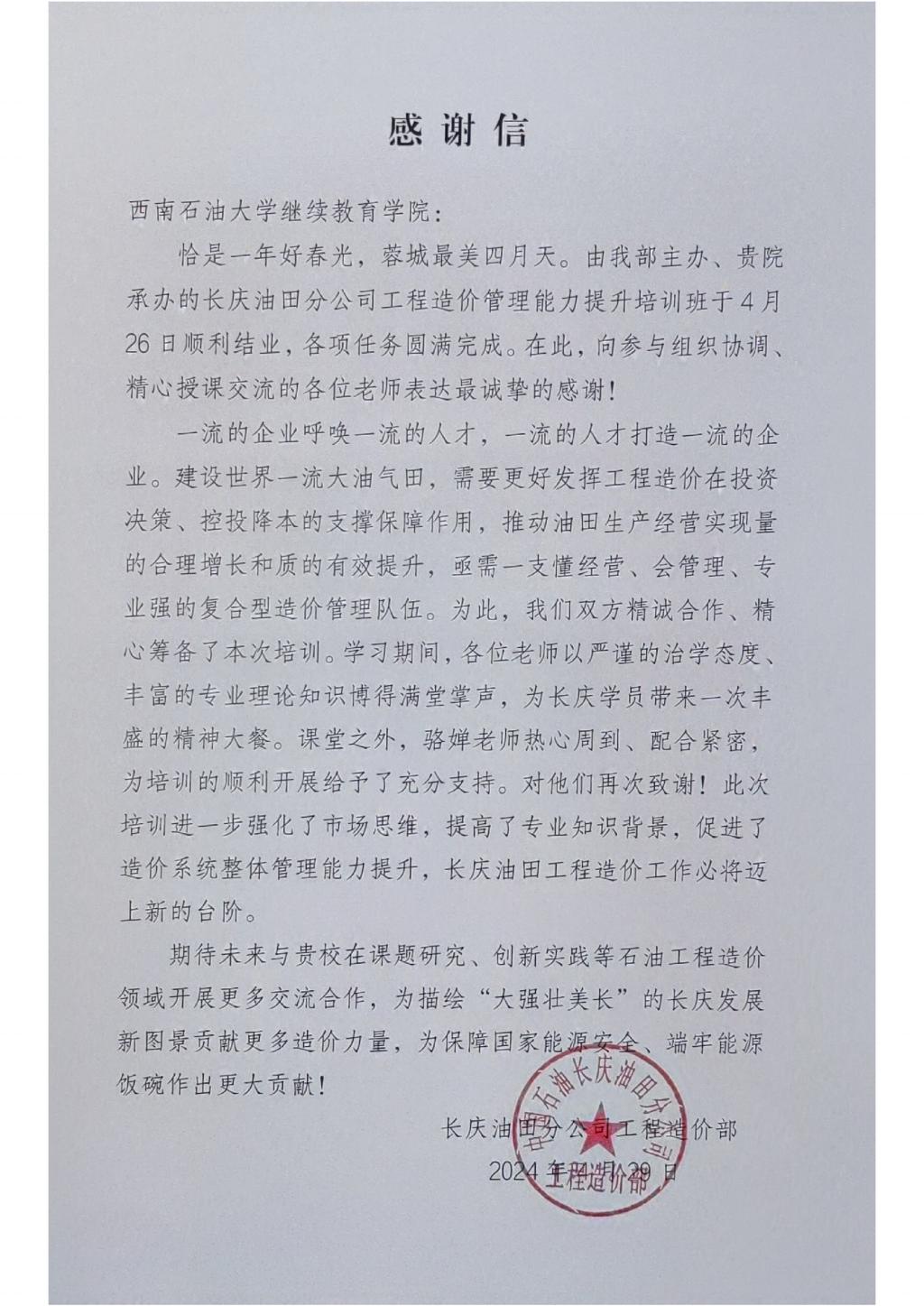 近日,長慶油田公司來信,感謝我校繼續教育學院作為承辦單位,對其主辦的工程造價管理能力提升培訓班順利結業所給予的大力支持。這是既去年該公司來信感謝我校承辦該公司青年技能骨干專業技術能力提升培訓班(第七期)后,又一次來信肯定我校培訓工作。