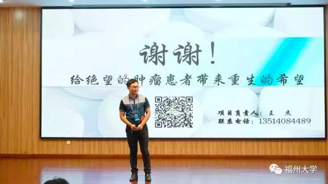 第三屆中國“互聯網+”大學生創新創業大賽總決賽上,福建省共奪得金獎4個、銀獎8個、銅獎16個,成績綜合排名位居全國第二,并獲大賽優秀組織獎;4個金獎項目指導老師獲優秀創新創業導師獎,廈門大學、福州大學和廈門理工學院獲得先進集體獎。福州大學王杰同學的《美她司酮:預防腫瘤擴散與轉移》,它以創意組第二名的成績捧得第三屆中國“互聯網+”大學生創新創業大賽的金獎。