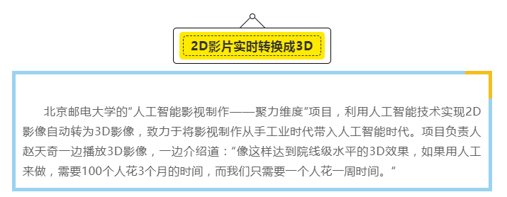 在第四屆中國“互聯網+”大學生創新創業大賽冠軍爭奪賽上,來自北京郵電大學的“人工智能影視制作——聚力維度”項目,堪稱影視制作“黑科技”,它可以將2D電影實時地直接轉換成3D,效率提升1000倍,打破了傳統3D影視制作高成本、耗時間的問題。在此次大賽中,獲得亞軍。