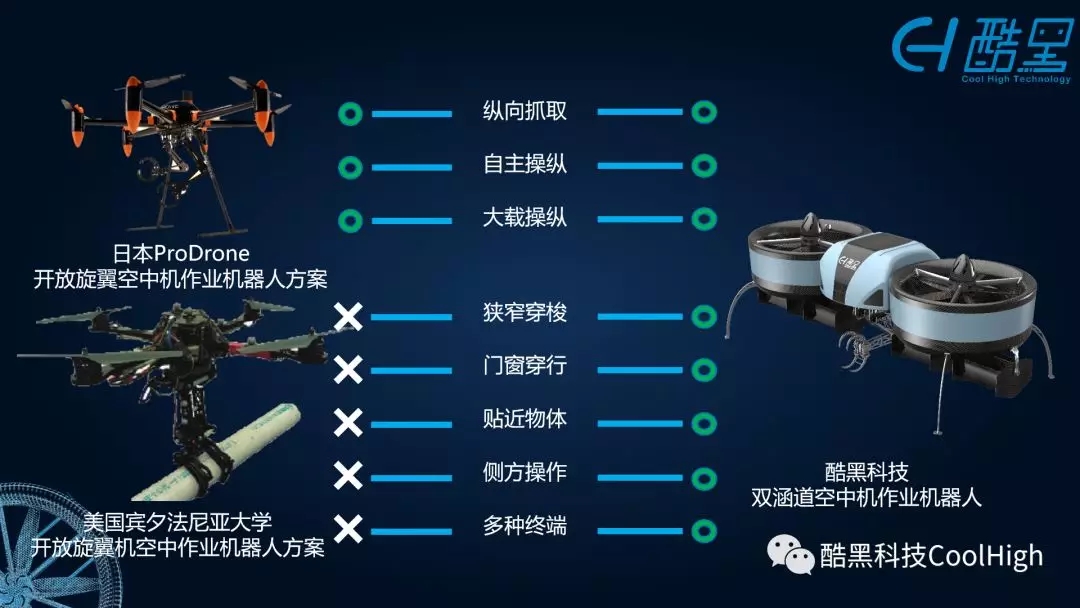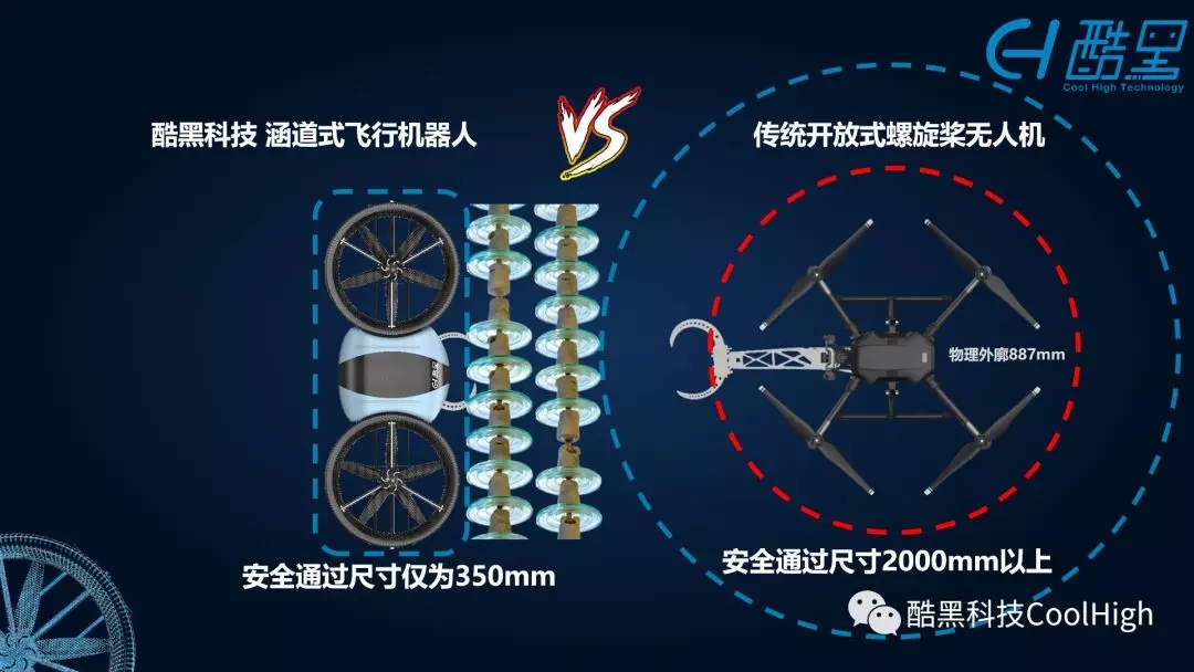 酷黑科技創(chuàng)始人徐彬博士從電力無人檢修、高層消防救援、反恐智能裝備等多個領域分析了現(xiàn)有的技術瓶頸和行業(yè)痛點,但是傳統(tǒng)開放式螺旋槳無人機無法完成接觸性作業(yè),而“飛天工兵”的縱列雙涵道氣動布局則可以滿足空中接觸作業(yè)的全部需求。