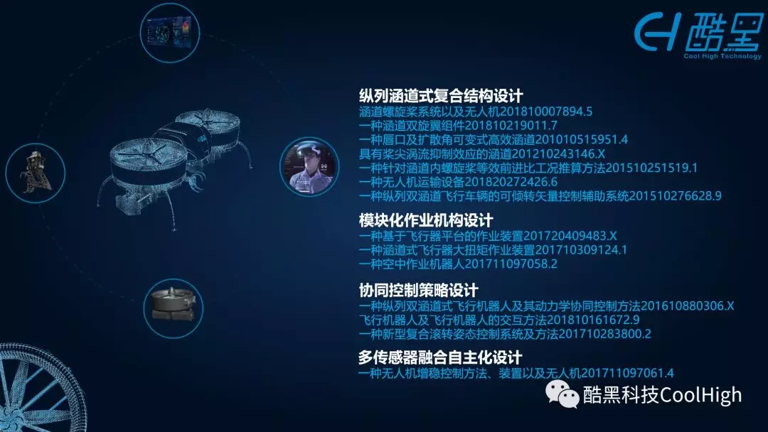 酷黑科技的技術人員均來自國內外知名高等學府,擁有博士以上學歷成員超過50%,研究生以上學歷成員超過90%的精英技術研發(fā)隊伍,在涵道式陸空智能裝備技術領域深入探索十余年,并連續(xù)承擔了“十一五”“十二五”“十三五”三個有關陸空兩棲機動平臺技術研究項目工作,在涵道式推進系統(tǒng)設計、新復合材料加工與制造工藝、高功率密度電驅動系統(tǒng)、高冗余安全機制分布式航空電驅動技術、飛行器與智能載荷協(xié)同控制技術、復雜環(huán)境下的空中自動駕駛技術、高功率高能量密度電池系統(tǒng)設計、陸空協(xié)同大數據調度系統(tǒng)等技術領域進行了大量知識產權布局,同時成功研制多型號原理功能樣機與產品,已經具備國際領先技術水平。