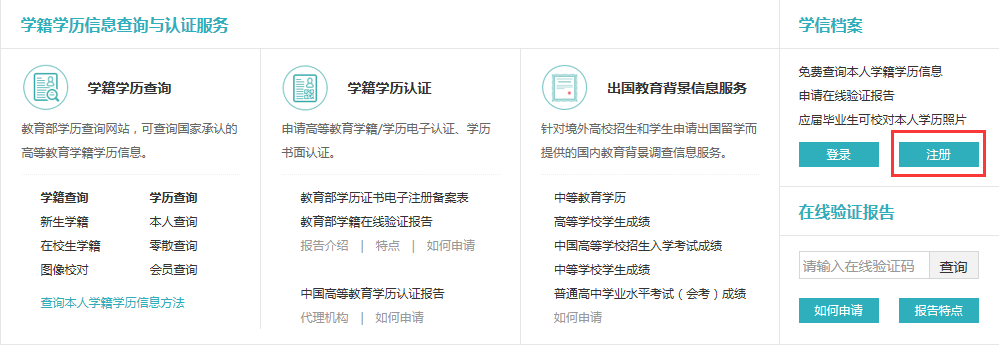第1步:登錄學(xué)信網(wǎng),點(diǎn)擊下圖中“注冊(cè)”按鈕,進(jìn)入學(xué)信檔案注冊(cè)頁(yè)面。如之前已注冊(cè)有學(xué)信網(wǎng)賬號(hào),可點(diǎn)擊“登錄”按鈕,直接進(jìn)入登錄頁(yè)面。