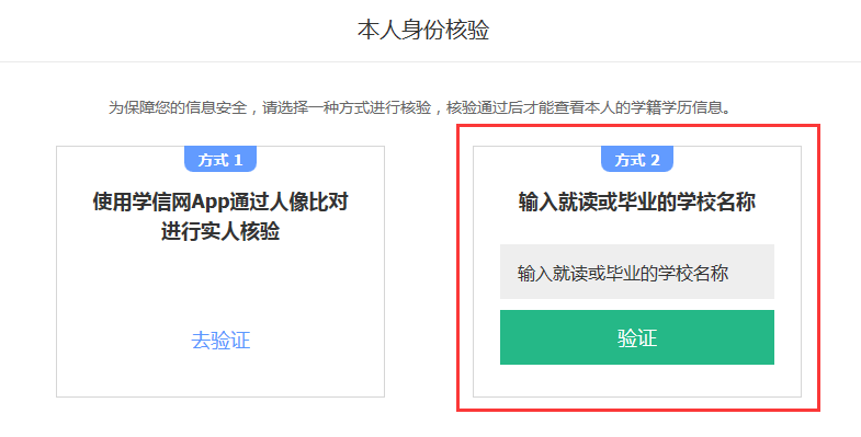 第4步:點(diǎn)擊上圖中“高等教育信息”圖標(biāo),進(jìn)入下一頁(yè)面,建議選擇“方式2”進(jìn)行核驗(yàn)。
