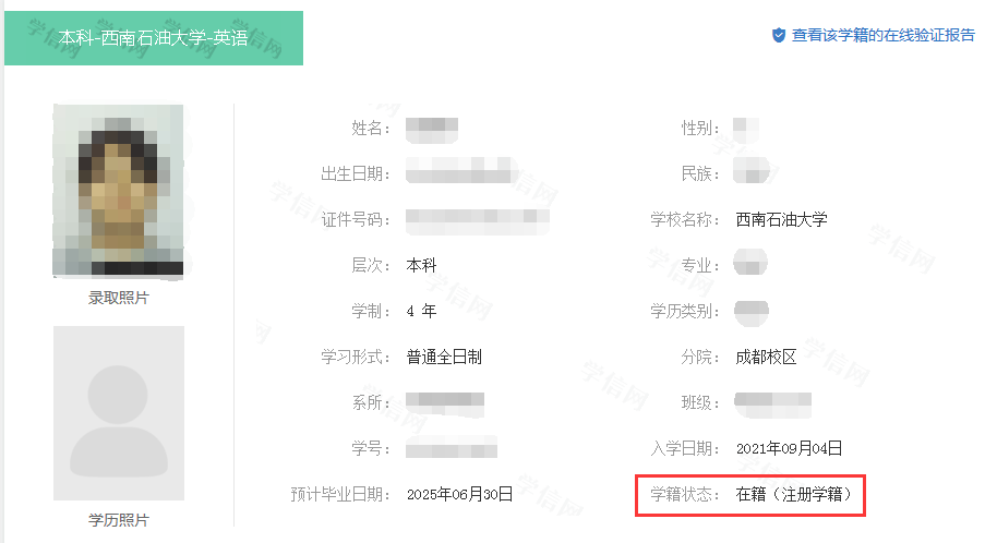 第5步:核驗(yàn)通過(guò)后進(jìn)入下面頁(yè)面,注冊(cè)人須對(duì)頁(yè)面顯示的學(xué)籍信息進(jìn)行逐一核對(duì),仔細(xì)核查注冊(cè)信息是否準(zhǔn)確,并確認(rèn)學(xué)籍狀態(tài)是否為“在籍(注冊(cè)學(xué)籍)”(如下圖),確認(rèn)注冊(cè)信息無(wú)誤后退出該系統(tǒng)即可。