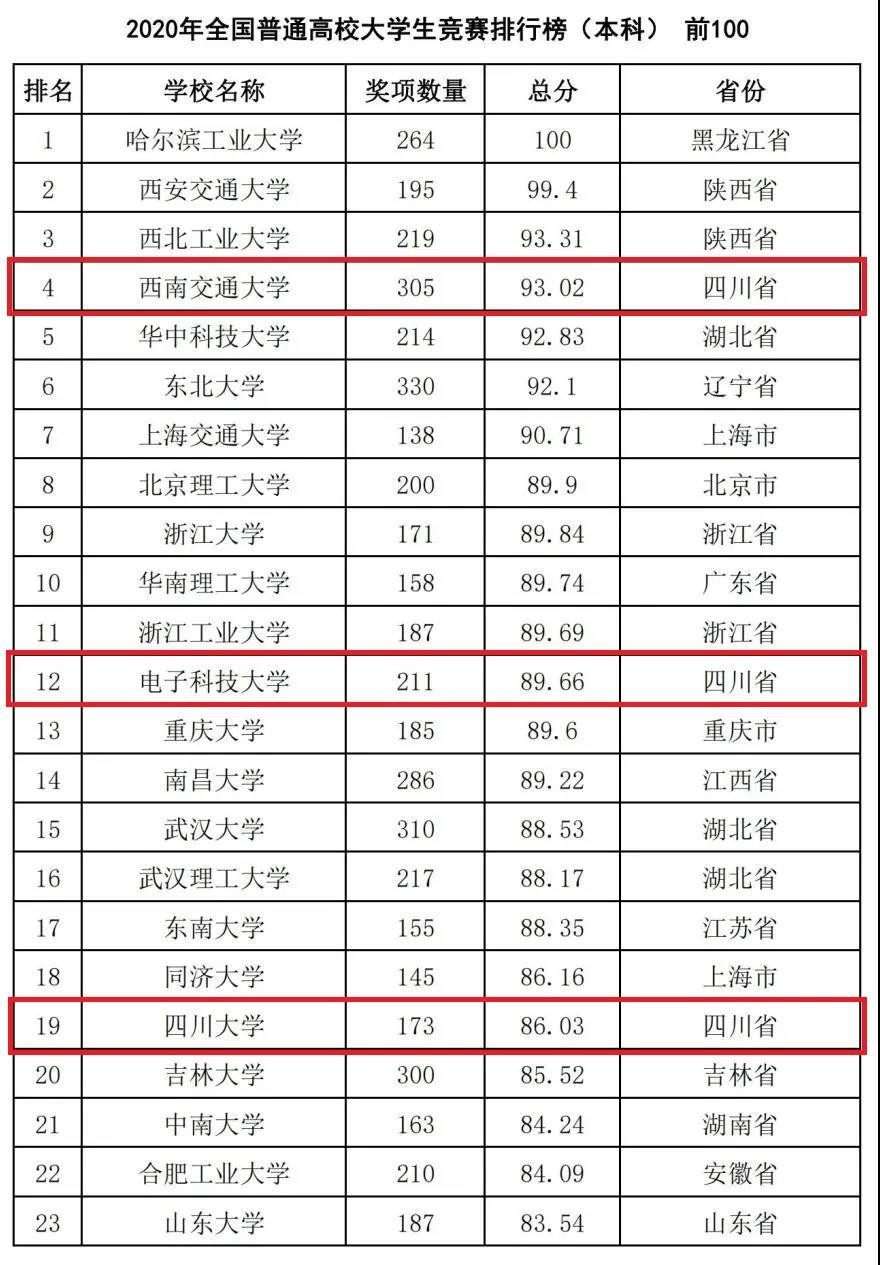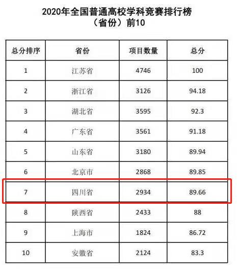 由中國高等教育學(xué)會(huì)發(fā)布的 2020 年全國普通高校大學(xué)生排行榜(省份)中,四川省以 2934 項(xiàng)獎(jiǎng)項(xiàng)、89.66 總分的成績位居全國第七。此外,在 2020 年全國普通高校大學(xué)生競(jìng)賽排行榜(本科)中,我省3 所高校進(jìn)入 top20 榜單,表現(xiàn)搶眼,其中西南交通大學(xué)位列全國第 4,電子科技大學(xué)位列全國第 12,四川大學(xué)位列全國第 19。此外,地方屬 3 所高校也進(jìn)入榜單前 100 序列,分別是西南石油大學(xué)第 33、四川師范大學(xué)第 80、西南科技大學(xué)第 100 名。此外,我省眾多高校排名比上一輪普遍提升,如西南交通大學(xué)提升 7 位、西南石油大學(xué)提升 26 位、四川師范大學(xué)首次進(jìn)入前 100 序列等。