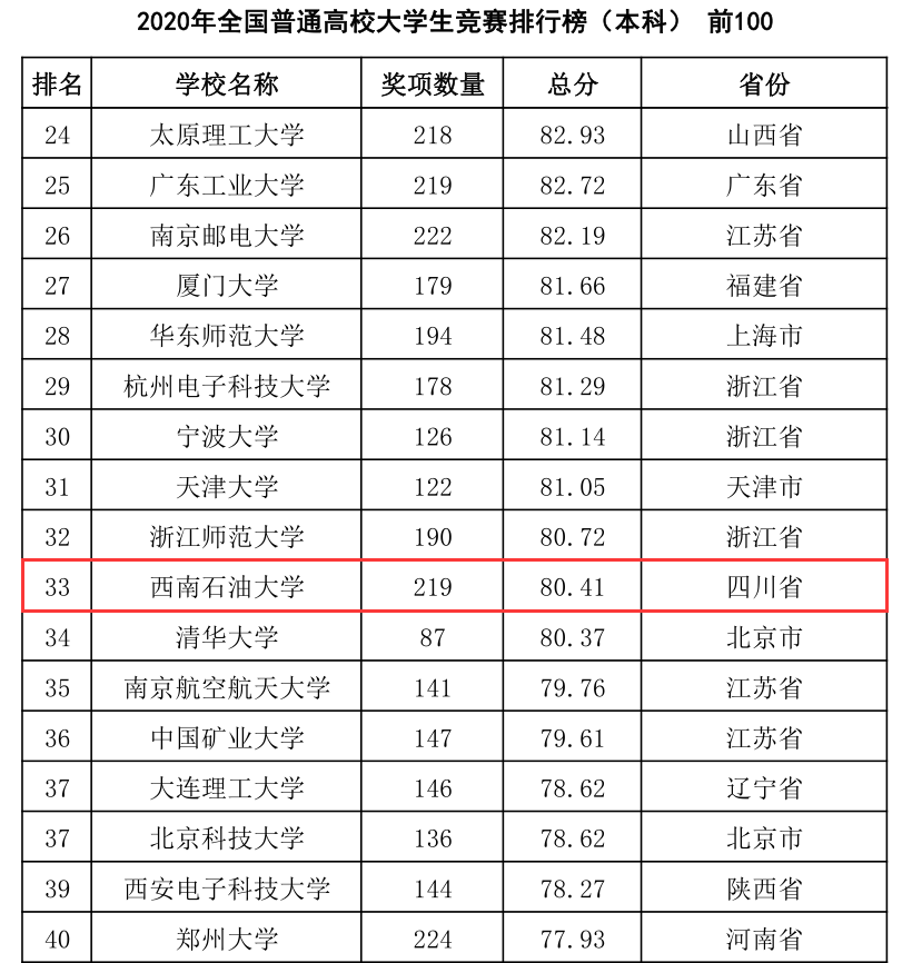 近日, 四川省教育廳 “對(duì)標(biāo)競(jìng)進(jìn) 爭(zhēng)創(chuàng)一流”活動(dòng)專刊第19期發(fā)布了題為“四川高校在 2020 年全國大學(xué)生競(jìng)賽排行榜中表現(xiàn)突出” 的專題簡報(bào),我校因排名提升26位獲教育廳表揚(yáng)。