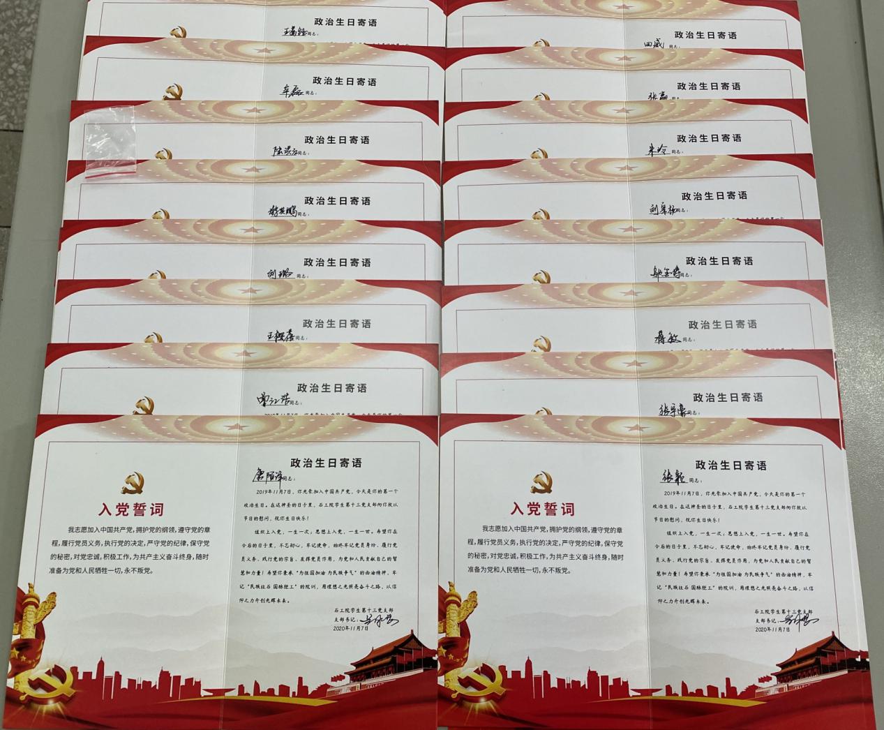 石工院學生第十三黨支部為過“政治生日”的黨員制作印有入黨誓詞和生日寄語的“政治生日”賀卡。閃閃發光的黨徽,洋溢著熱情的“政治生日”賀詞,上面記錄著入黨時間和黨組織深深的祝福,讓黨員留下一份深刻的“政治生日”印記,激勵他們充分發揮黨員的模范帶頭、示范引領作用。