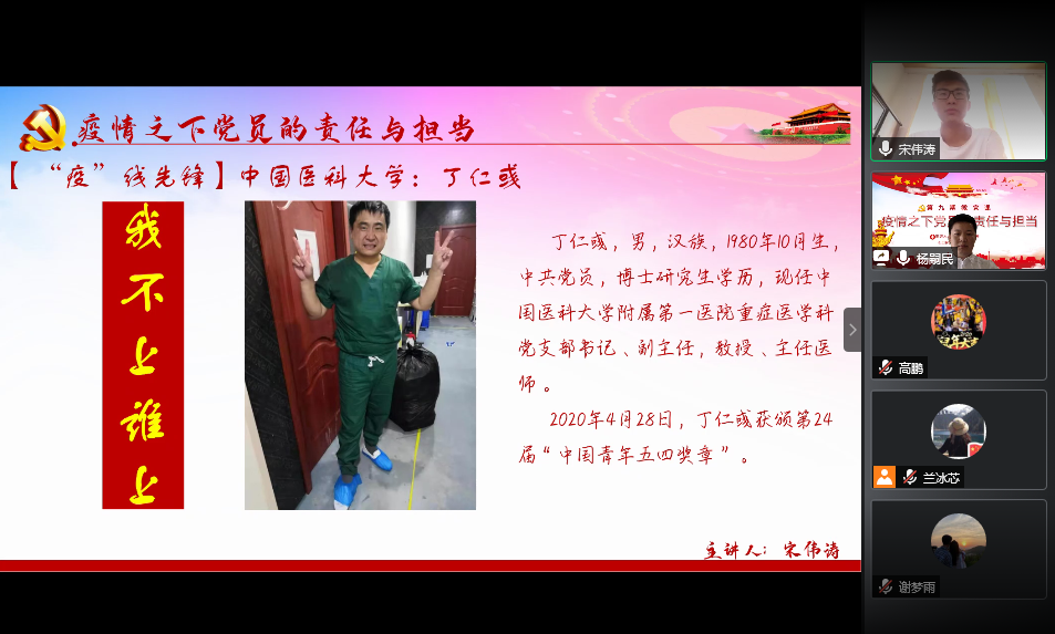 楊嗣民、宋偉濤作為第九期微黨課主講人,圍繞《疫情之下黨員的責任與擔當》,以鐘南山、李蘭娟、張文宏醫者仁心的故事為例,講述了共產黨員組織入黨一生一次、思想行動入黨一生一世的思想自覺和行動自覺。宋偉濤講述了“扶貧之花”黃文秀、遼寧援鄂醫療隊隊長丁仁彧的動人事跡,引導支部黨員勇挑責任擔當。