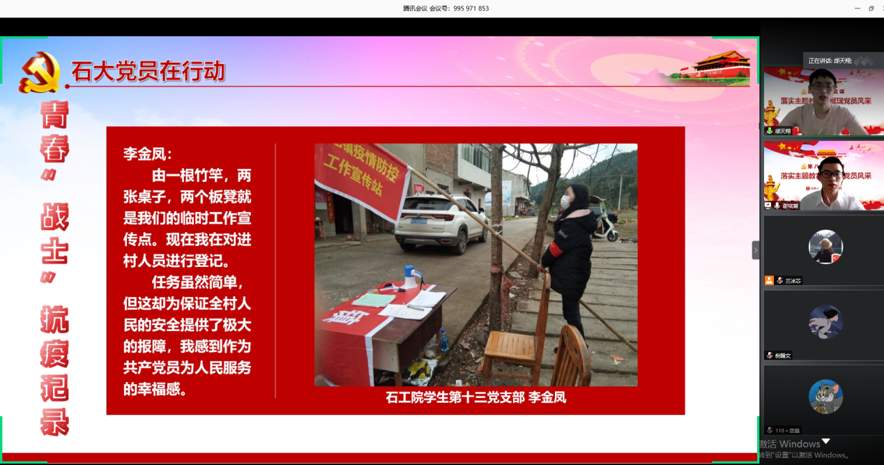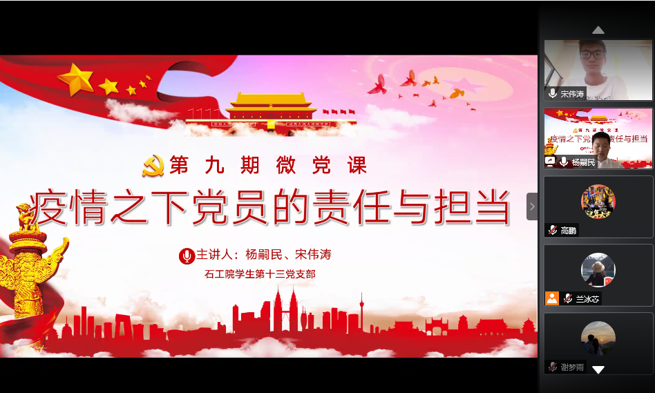 編者按:為持續推進“不忘初心、牢記使命”主題教育縱深化發展,結合抗疫實踐深化大學生愛國情、強國志和報國行。石工院學生第十三黨支部利用“互聯網+”黨建培育新模式,啟動了“教是更好的學 預備黨員講黨課”系列線上翻轉微黨課活動,每周四下午讓每一名預備期的黨員同志講一次黨課,創新了黨員教育培養方式。