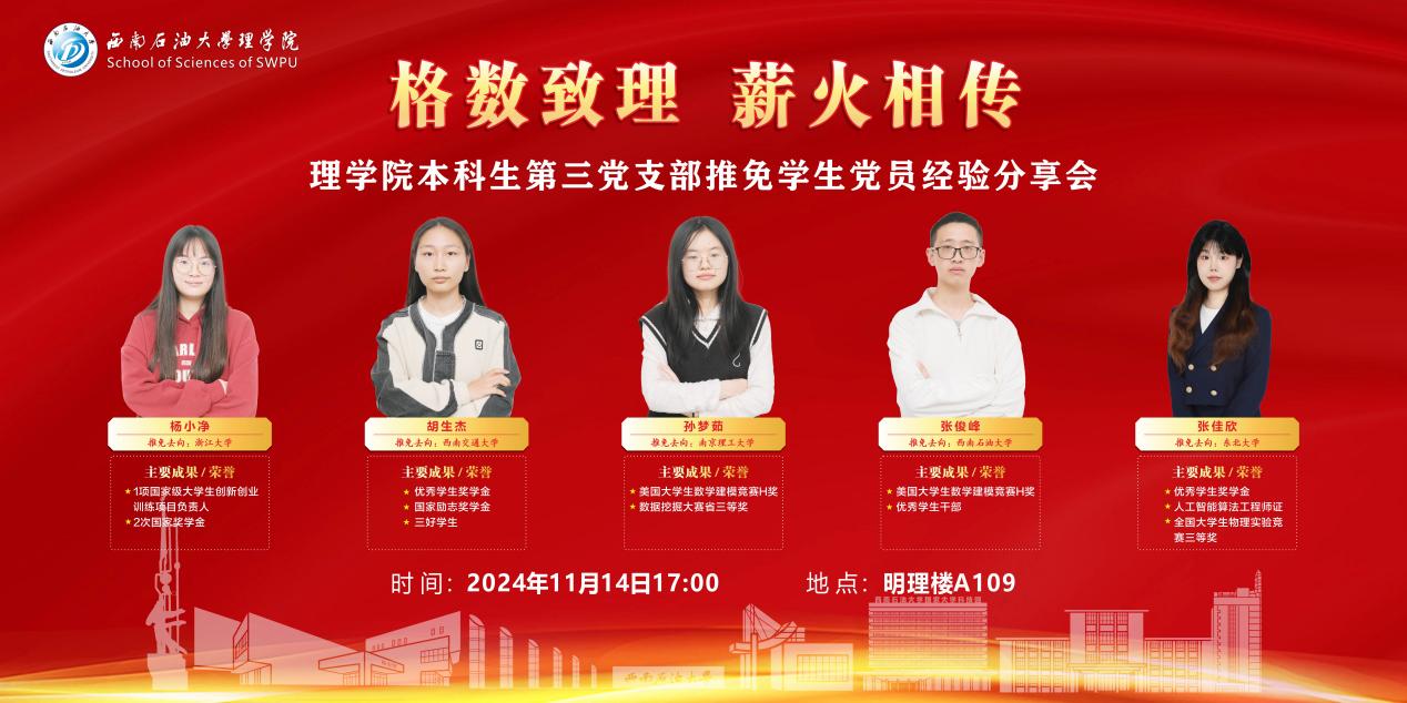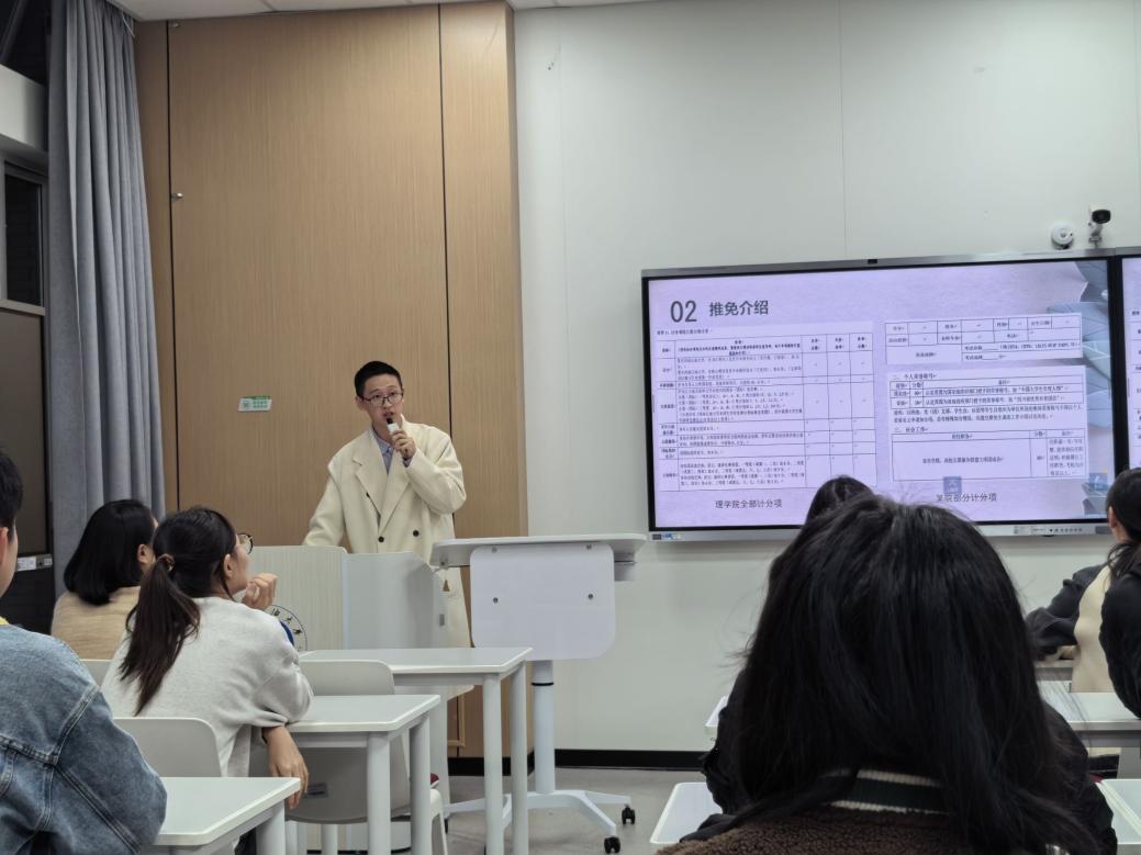 11月14日,為發(fā)揮優(yōu)秀學(xué)生黨員的傳幫帶作用,幫助在校學(xué)生了解推免政策及流程,明確努力方向,做好生涯規(guī)劃,理學(xué)院本科生第三支部在明理樓開展了推免學(xué)生黨員經(jīng)驗(yàn)分享會,五名推免學(xué)生黨員依次就學(xué)業(yè)規(guī)劃與推免準(zhǔn)備等問題分享了自己的經(jīng)驗(yàn)感悟。