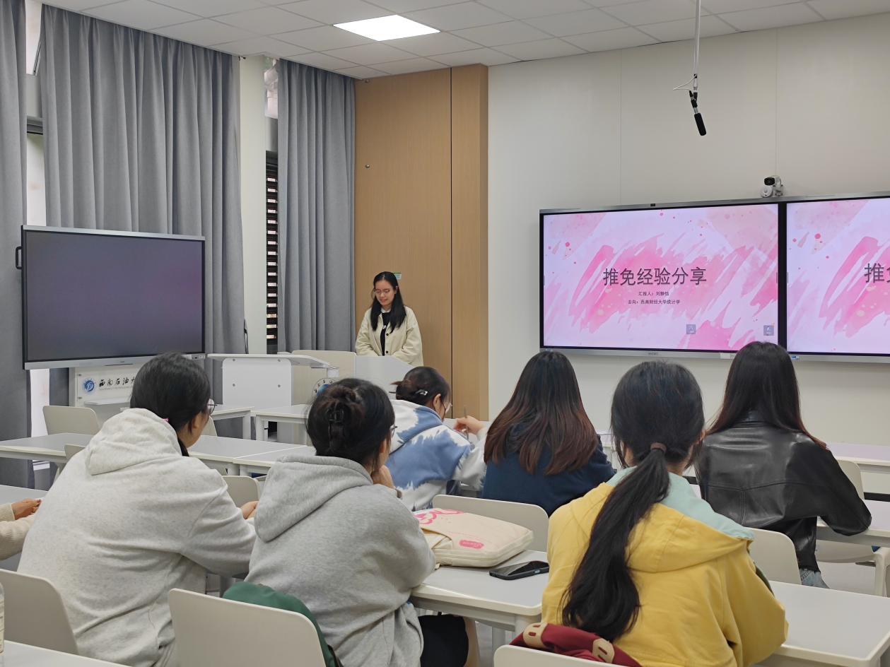 5名推免黨員逐一上臺,圍繞自己的推免經歷、學習方法、時間管理以及心態(tài)調整等方面進行了深入的分享。劉靜怡從往屆的推免政策解讀入手,為學弟學妹們詳細介紹了往屆推免的基本流程,強調了如何搜集、整合相關信息。向九霖和李琪洋重點分享了大學前三年的學習生活經歷及推免心路歷程,表示“路漫漫其修遠兮,吾將上下而求索”,鼓勵學弟學妹們路遙不墜志向,行遠不改初衷。趙雨珊和趙雪美則從推免前期準備、推免面試技巧等方面為同學們進行了分享,鼓勵大家要打牢專業(yè)基礎,勇于主動嘗試,保持自信樂觀,學會自我調適。他們用自己的親身經歷告訴學弟學妹們,推免之路并非一帆風順,但只要目標明確、堅持不懈,便也可以散發(fā)燦爛光芒。