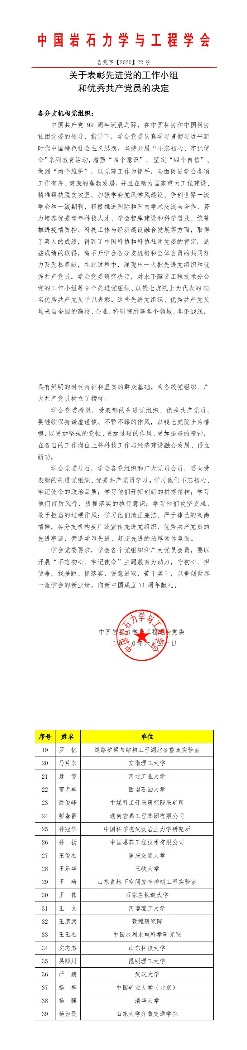 在中國共產黨99周年誕辰之際,中國巖石力學與工程學會公布了《關于表彰先進黨的工作小組和優秀共產黨員的決定》,機電院院甯尤軍教授榮獲“優秀共產黨員”稱號。