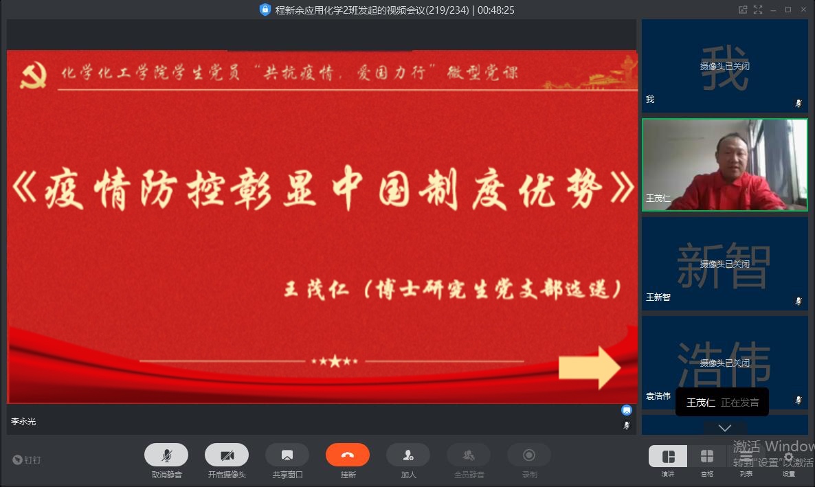為深入學習貫徹習近平總書記重要指示精神,堅決貫徹黨中央關于新冠肺炎疫情防控各項決策部署,展現出新時期大學生黨員擔當作為、共克時艱的良好風貌,深入推進愛國主義教育,進一步激發學生黨員的責任擔當,凝聚打贏疫情防控的磅礴力量。化工院于4月2日14:30,利用釘釘直播軟件,開展了學生黨員“共抗疫情·愛國力行”微黨課公開巡講,透過正發生在中國的火熱事件,將疫情防控工作涌現的案例轉化為鮮活課堂。化工院全體黨支部書記、學生黨員均參與到本次活動中。