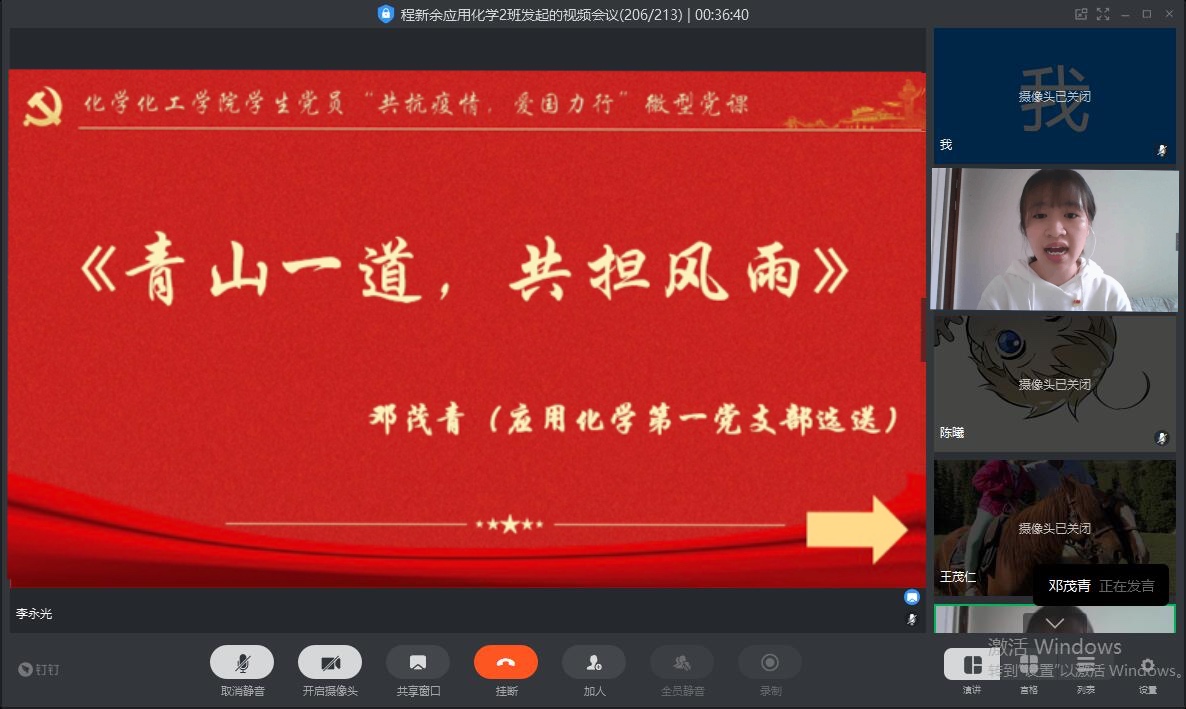 應用化學第一黨支部黨員鄧茂清同學講述了抗擊疫情期間英雄醫護的故事,包括主動請纓的杜富佳護士,連晝轉車卻不幸感染病毒的郭琴護士;