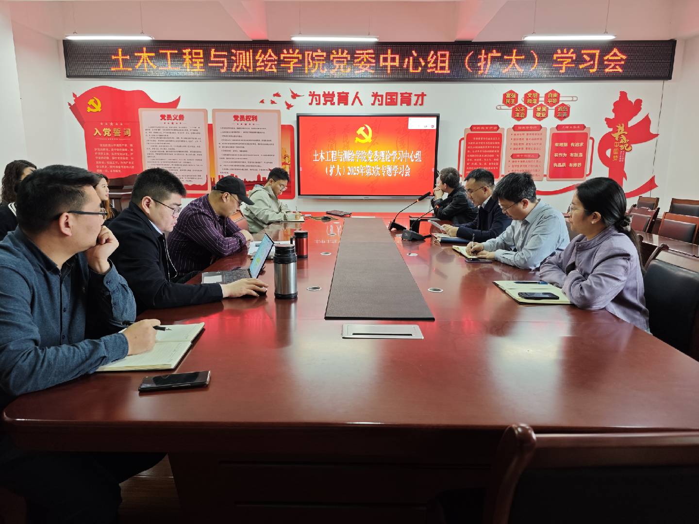 3月27日,土木工程與測繪學院黨委中心組召開第三次學習(擴大)會議,圍繞全國兩會精神、政府工作報告及中央八項規定開展專題研討。學院黨委書記熊俊楠主持會議,學院領導班子、黨委委員、全體黨支部書記及科室負責人參會。