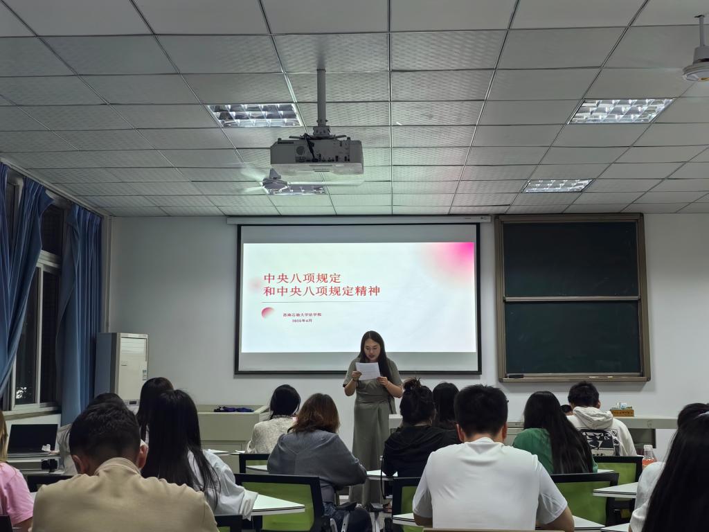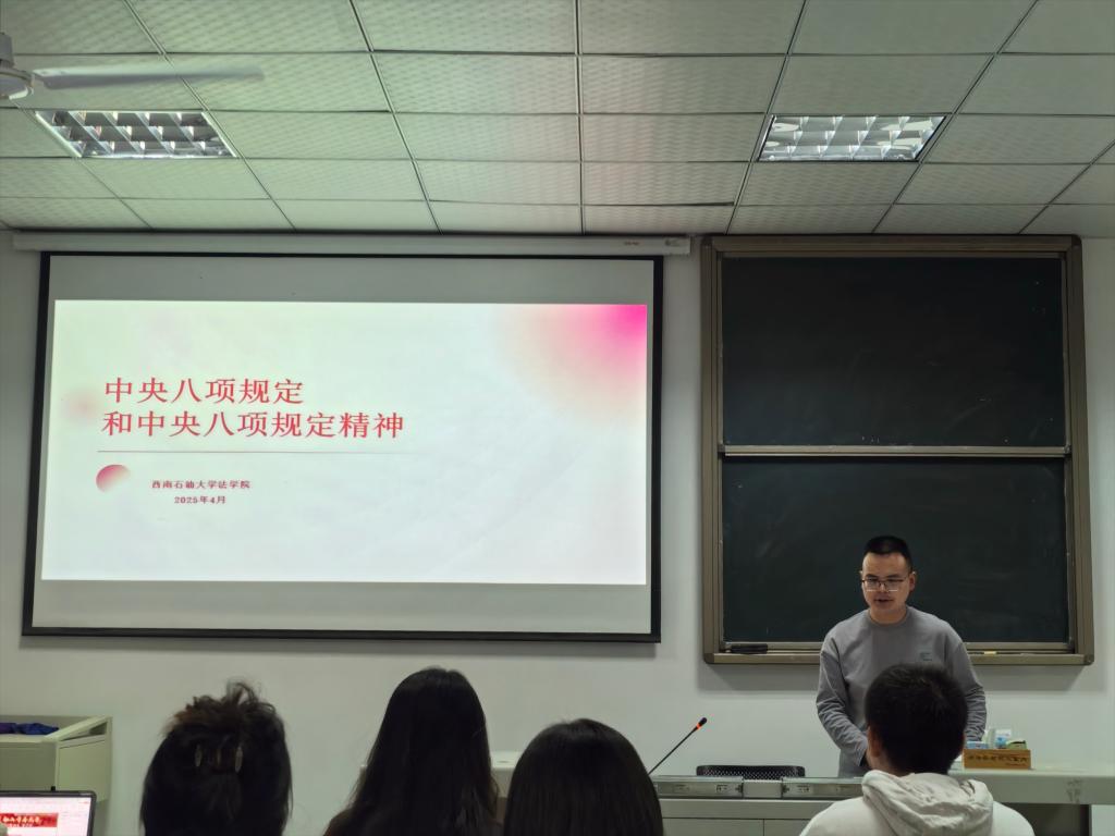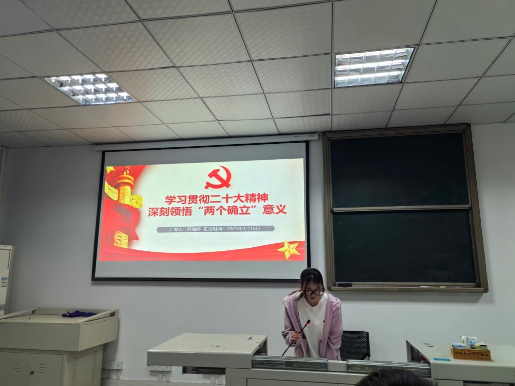 會議第一項,發展對象培訓班指導老師邵梧梟以中央八項規定為主題,深入貫徹中央八項規定精神學習教育。他強調,青年學子肩負著維護社會公平正義的重任,更應率先垂范,以中央八項規定精神為準則,筑牢拒腐防變的思想防線。接著,法學專業學生第三黨支部成員鮮海婷領學“兩個確立”理論。他從歷史邏輯、理論邏輯和實踐邏輯三個維度,詳細解讀“兩個確立”的科學內涵。她鼓勵大家,要將“兩個確立”的理論自覺轉化為堅定擁護“兩個維護”的行動自覺。
