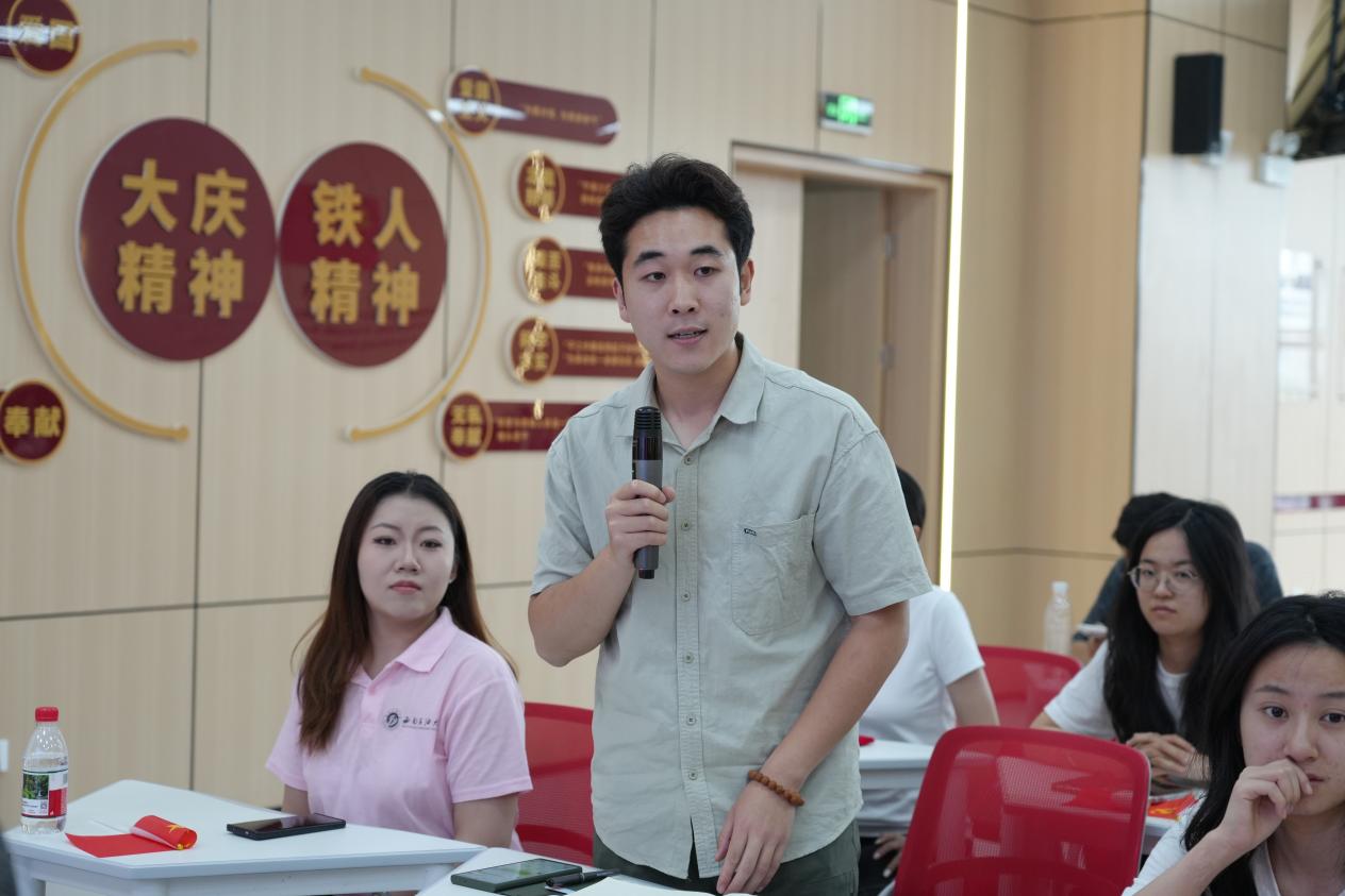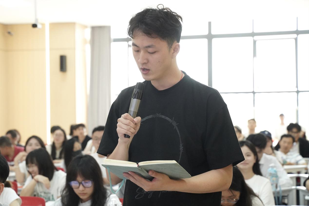 在交流互動(dòng)提問環(huán)節(jié),廣播電視編導(dǎo)專業(yè)2022級(jí)退伍復(fù)學(xué)學(xué)生余晨分享了自己在軍旅與校園生活中的感悟,并就自己下一步軍隊(duì)文職的就業(yè)方向分享了規(guī)劃與困惑。同為退伍復(fù)學(xué)的播音與主持藝術(shù)專業(yè)2022級(jí)學(xué)生楊浩然,也結(jié)合自身經(jīng)歷,表達(dá)了將來扎根基層工作的志向。同學(xué)們積極踴躍交流、勇敢表達(dá)理想,生動(dòng)詮釋了“青春心向黨”的堅(jiān)定信念。