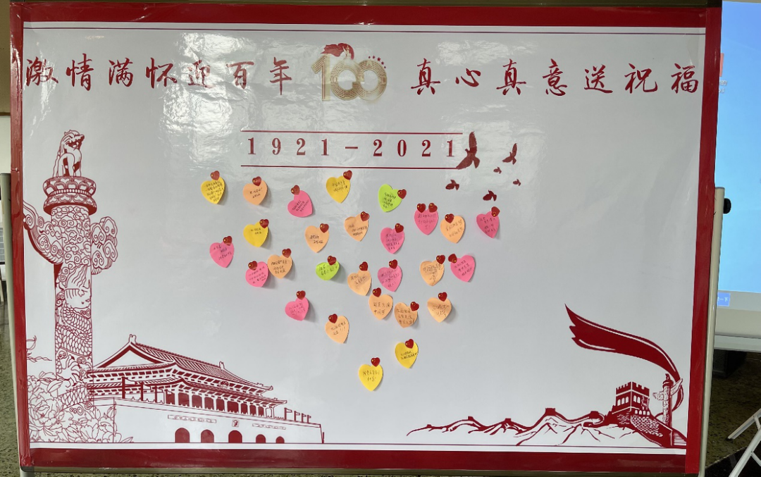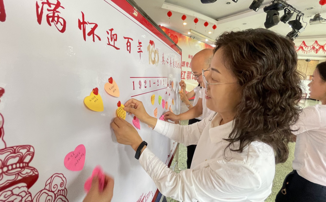 紅歌比賽中途還特別設計了“送祝福”活動,黨員們紛紛拿起紙筆,在一張張卡片上寫下了自己對黨百年華誕的祝福語,“高舉國旗跟黨走,砥礪奮進新時代”、“偉大的黨生日快樂”等祝福語躍然紙上,黨員們通過筆端訴說了自己對黨的一片深情。