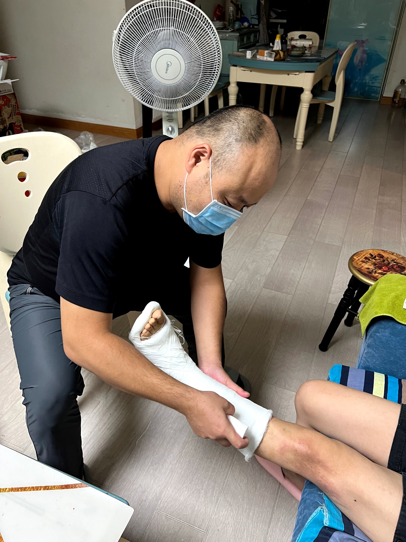 疫情期間醫(yī)務人員上門為骨折教職工包扎