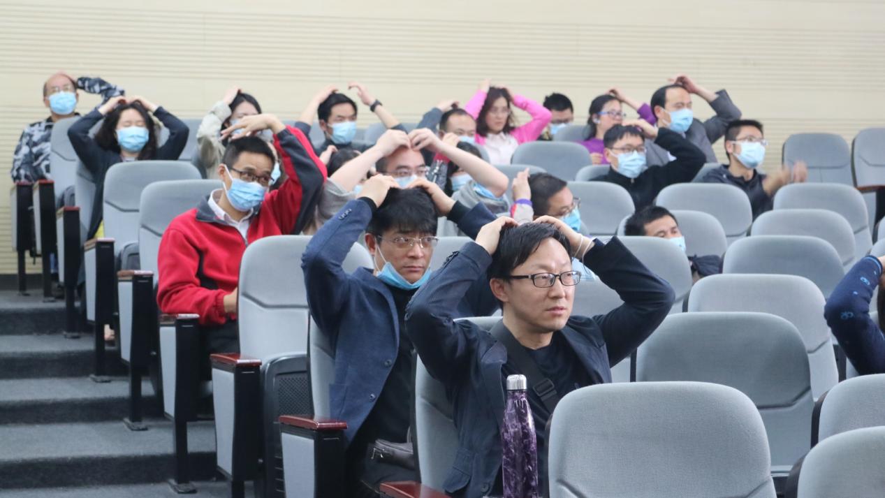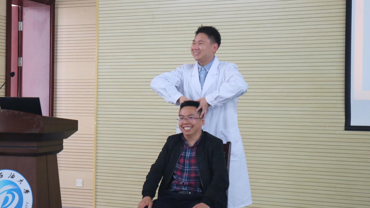 講座上,王涵醫生從頸椎病常見癥狀、治療方法、預防手段等方面,深入淺出地講解了頸椎病防治知識,現場邀請老師上臺,示范如何通過按壓穴位進行自我放松,現場教授肩頸放松“米字操”。“確實感覺放松多了”,上臺“當模特”的老師感嘆。