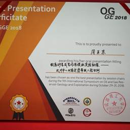 我院博士研究生付永紅及碩士研究生周亞?wèn)|、劉雄偉在蔣裕強(qiáng)教授的帶領(lǐng)下參加了本次會(huì)議并分別作題為《基于低場(chǎng)核磁共振劃分渝西深層頁(yè)巖儲(chǔ)層孔隙流體性質(zhì)及可開(kāi)發(fā)性》、《致密砂巖成巖作用模擬實(shí)驗(yàn)初探—以川中~川南過(guò)渡帶須二段為例》和《川南地區(qū)深淺層海相頁(yè)巖儲(chǔ)層特征差異性研究》的分會(huì)場(chǎng)口頭報(bào)告。其中周亞?wèn)|同學(xué)獲得“Best Presentation Cerficitate of OGGE 2018”獎(jiǎng)項(xiàng)。