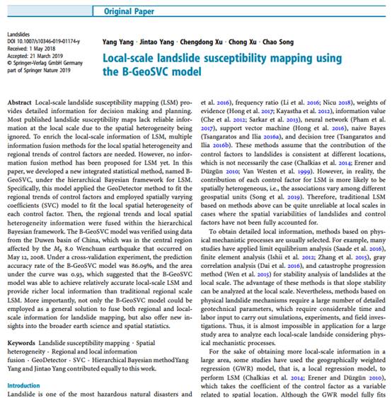 《Landslides》是地學“工程:地質”領域的頂級期刊,最新影響因子3.811,位于中科院JCR分區一區。我院GIS專業楊洋副教授為本文第一作者,我院GIS專業青年教師宋超為本文獨立通訊作者。楊洋,宋超教師均為空間所科研團隊骨干成員。