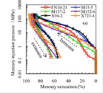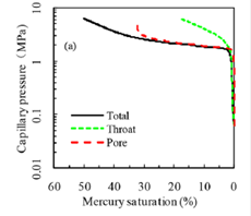 針對跨尺度納米——微米級孔隙的非常規儲層,高壓壓汞具有探測納米級(>3.6nm)孔喉的優點,得到孔喉半徑及分布。但是,該方法受到“pore-blocking”的影響,對大孔喉的反映造成影響。相比于高壓壓汞,恒速壓汞具有可以區分孔隙、喉道并分別計算得到孔隙、喉道分布的優點;但是,受有限壓力的限制(<6.2Mpa),該方法難以反映納米級(<0.12um)的孔喉;同時,巖心鑄體薄片顯示,恒速壓汞得到的孔隙半徑偏大,與實際不符。鑒于此,充分利用高壓壓汞與恒速壓汞的優點,得到了反映巖石納米——微米級跨尺度喉道分布特征。