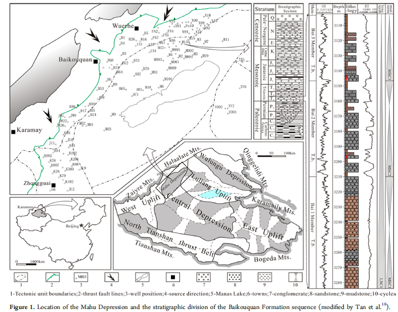 該論文以瑪湖凹陷三疊系百口泉組致密砂礫巖為研究對象(圖2),針對孔隙結構表征方法(高壓壓汞、恒速壓汞、核磁共振等)普遍存在的缺點,提出了表征致密儲層孔隙結構(孔隙分布、喉道分布、孔喉分布等)及分類的新方法與新標準(圖3與圖4)。進一步,論文探討了孔隙結構對儲層物性及滲流的控制機理。研究成果對致密儲層的表征、非常規油氣的勘探開發具有重要實用價值及學術意義。