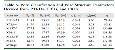 論文在孔隙結構表征的基礎上,針對IUPAC(國際理論和應用化學聯合會)以及Loucks等人對致密儲層分類的局限性,提出了新的分類標準:孔隙類型I(孔喉半徑大于1um)、孔隙類型II(孔喉半徑0.1—1um)、孔隙類型III(孔喉半徑小于0.1um)(表1)。進一步,探討了孔隙結構對儲層物性及滲流的控制機理。