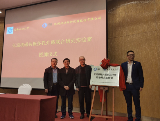 會議舉行了“低溫核磁共振多孔介質聯合研究實驗室”共建協議簽字及授牌儀式。該聯合研究實驗室是蘇州紐邁分析儀器股份有限公司與我校聯合共建,依托地球科學與技術學院。蘇州紐邁分析儀器股份有限公司副總經理張英力、產品和銷售總監高楊文、蘇州紐邁國家博士后工作站站長燕軍教授、西南石油大學科研處副處長何蘇、地科院副院長趙曉明及該聯合研究實驗室主任蔣裕強教授出席簽字授牌儀式。
