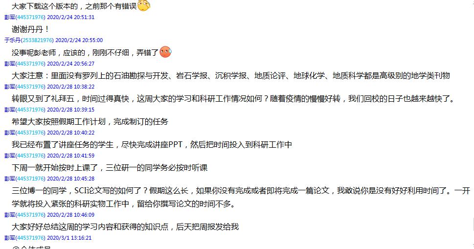 譚秀成教授通過電話連線、實驗室QQ群提醒、討論組語音通話等方式督促同學們學習,與學生展開學術交流的碰撞,耐心為學子答疑解惑。碩士生謝康在譚秀成老師的在線指導下完成了“鄂爾多斯盆地奧陶系……”等2篇文章的撰寫,準備投稿。團隊碩士生鐘壽康因過年回家沒帶硬盤,資料都在實驗室電腦里面,無法開展論文寫作,譚老師則擔起了從實驗室為學生快遞硬盤的任務。此外擔憂研究生畢業寫作進度并及時進行在線指導,譚老師更加注重對李明隆等5位碩士生以及蘇成鵬、羅思聰2位博士生的畢業論文指導,嚴把論文質量關,延期開學學位論文質量不打折。
