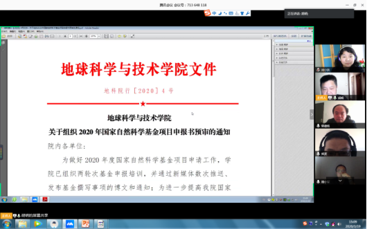 在近1小時的會議中,胡明主任帶領大家共同學習了“關于2020年春季學期本科生繼續實施在線教學的通知”、“地球科學與技術學院關于組織2020年國家自然科學基金項目申報書預審的通知”、“關于做好疫情防控期間保密管理提醒工作的通知”等相關文件。同時,對2019年教研室取得的成績進行了全面總結,對每位老師的貢獻給予了充分的肯定,對面對疫情,全校師生及校友們踴躍捐款捐物,教研室老師們積極準備課程在線教學的行為,朱貝、王浩錚等青年教師組織并參與的“青年教師科普與學術系列活動”,給予了高度贊揚,并號召年輕老師積極加入到系列活動中去。