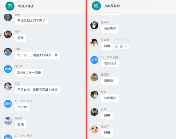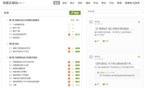 為了上好新課《地基及基礎》,張伯虎副教授綜合利用超星和中國大學MOOC平臺建立網課,采用釘釘直播+速課錄制進行課程講解,運用學習通進行教學管理與測試,綜合手段的利用讓學生選擇余地更大,學習時間更加靈活。直播課堂上,張老師跟學生無話不談,經常停下來回答學生的問題。一張PPT上畫足了記號;一張白板,公式推導一目了然。教學實施中,通過學習通簽到、投票、測試、作業、通知和討論等,讓學生學習不再枯燥。