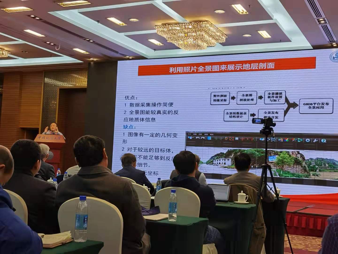我院張廷山教授在大會上作了《基于虛擬現實的野外地質實習教學輔助平臺建設》主題發(fā)言,向參會代表全面介紹了國際、國內數字露頭與虛擬仿真現狀以及我院虛擬仿真實驗室及數字露頭的建設情況、特點及下一步規(guī)劃,受到與會代表的熱烈響應。