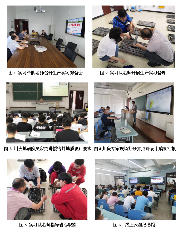 實習過程中,學院邀請了川西北氣礦的熊安璐、羅靜和王旭麗3位專家通過在線講座向同學們講解了中國石油的HSE管理理念、油氣藏開發過程中的動態地質分析以及川西北氣礦的研究現狀等,全方面、多維度地展示了油田工作者的工作內容。校內老師安先彬在學校實習實訓基地就鉆井、地質錄井及油氣的開采、集輸過程等方面給同學們做了詳細的介紹。為加強工程設計能力的培養,本次生產實習特別新增了鉆井地質設計環節,邀請到川慶鉆探公司“吳家杰巾幗創新工作室”負責人吳家杰(鉆井地質設計專家)到校給同學們講授一天的鉆井地質設計的要求、設計內容和方法。同學們根據現場資料,應用課程所學知識,通過小組合作開展4天的鉆井地質設計,最后以PPT形式進行了成果匯報。川慶地研院尹平、吳家杰兩位專家結合自身工作實例進行了現場點評并給大家提出了合理建議,極大地激發了同學們的學習熱情。隨后,實習隊老師對本次生產實習的重點內容——巖心和巖屑觀察描述展開了教學,通過分組觀察描述并分別繪制巖心、巖屑錄井圖,切實做到了理論聯系實際,增強了同學們的動手能力。在初步了解川西北氣礦的勘探開發現狀的基礎上,為了讓同學們更好地了解四川盆地的油氣勘探開發歷程,實習隊特別精心組織同學們線上云游四川石油會戰史館、紅村石油會戰舊址、毛主席視察隆昌氣礦紀念館,使同學們對四川油氣60余載的勘探開發歷程、3次史詩般油氣會戰和取得的偉大成就有了清晰的認識,深深地被“艱苦奮斗、求實創新”的川油精神所感動,進一步堅定了同學們繼承石油精神,興油報國的理想信念。