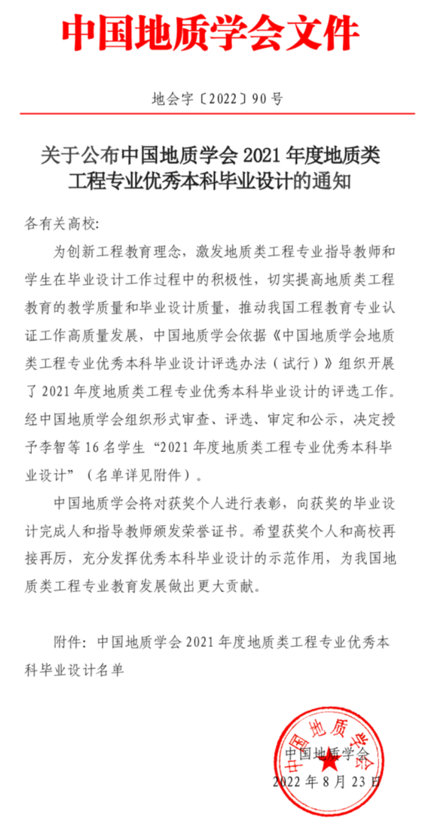2022年08月23日,中國地質學會公布了2021年度地質類工程專業優秀本科畢業設計,經中國地質學會組織形式審查、評選、審定和公示,決定授予李智等16名學生“2021年度地質類工程專業優秀本科畢業設計”。