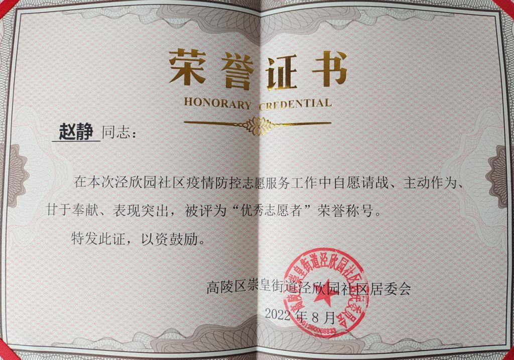 入黨積極分子趙靜獲“優秀志愿者”