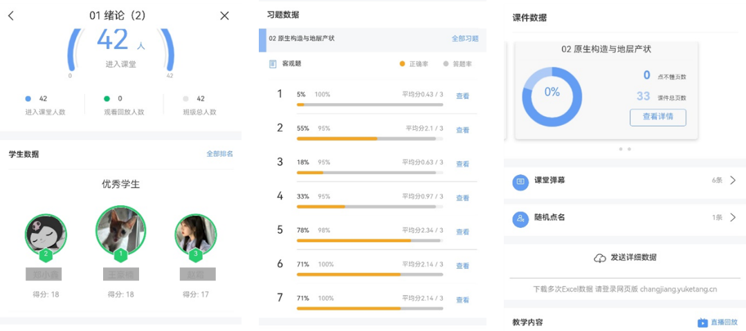 (1)課前學習任務推送及反饋:通過雨課堂的課件推送功能,提出課前自主學習要求和學習任務,并通過課件中的閱讀和測驗功能,及時了解學生的學習進度和學習效果(圖2),針對學生自學過程中的弱項知識點,調整課堂直播教學的重點和難點。