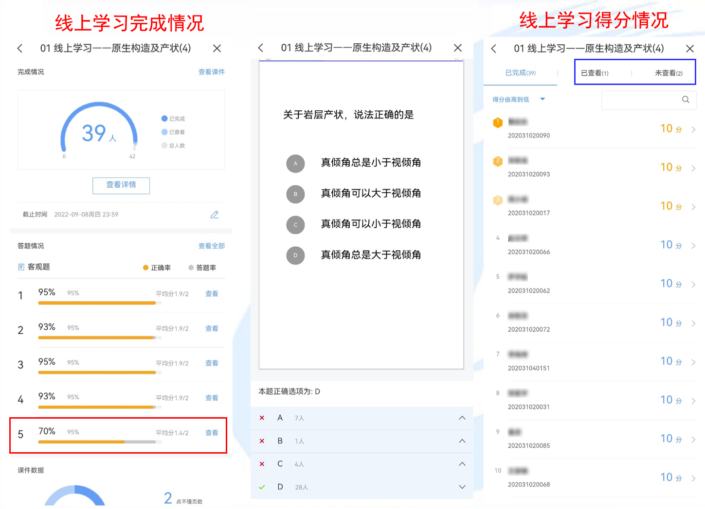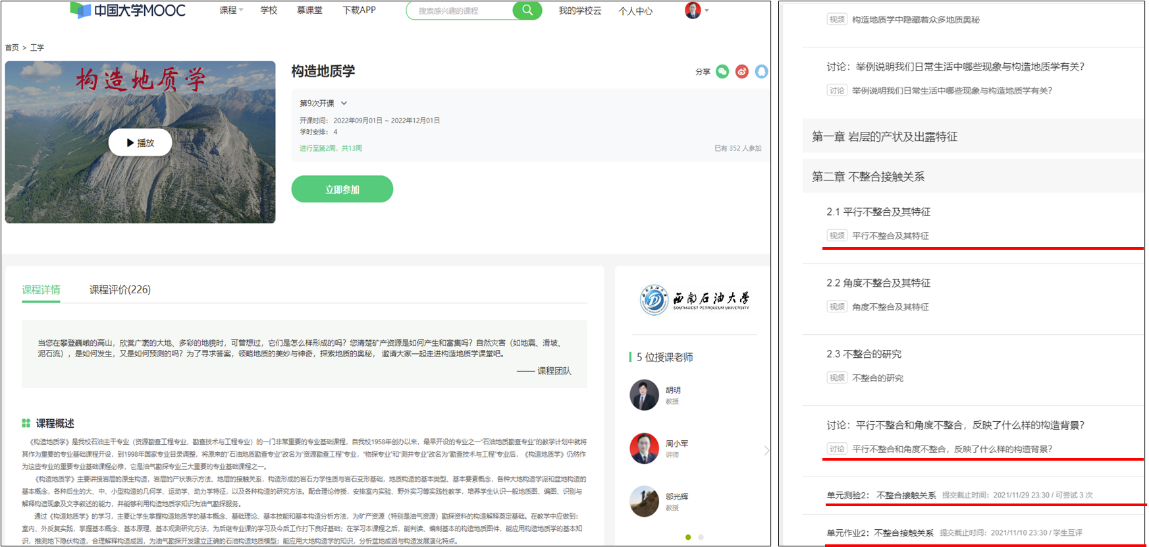 針對基礎理論和基本概念,采用了學生自主線上學習的方式進行。經過課程團隊成員多年來的努力,已經在中國大學慕課平臺上打造出了四川省省級一流課程《構造地質學》,并全面開放,可供學生根據自己的需求,靈活使用碎片化時間、反復多次的進行線上自主學習,深刻理解本課程中的基本理論知識和基本概念,網站課程中也設置有隨堂測驗,以檢驗和評估學生自學效果(圖1)。