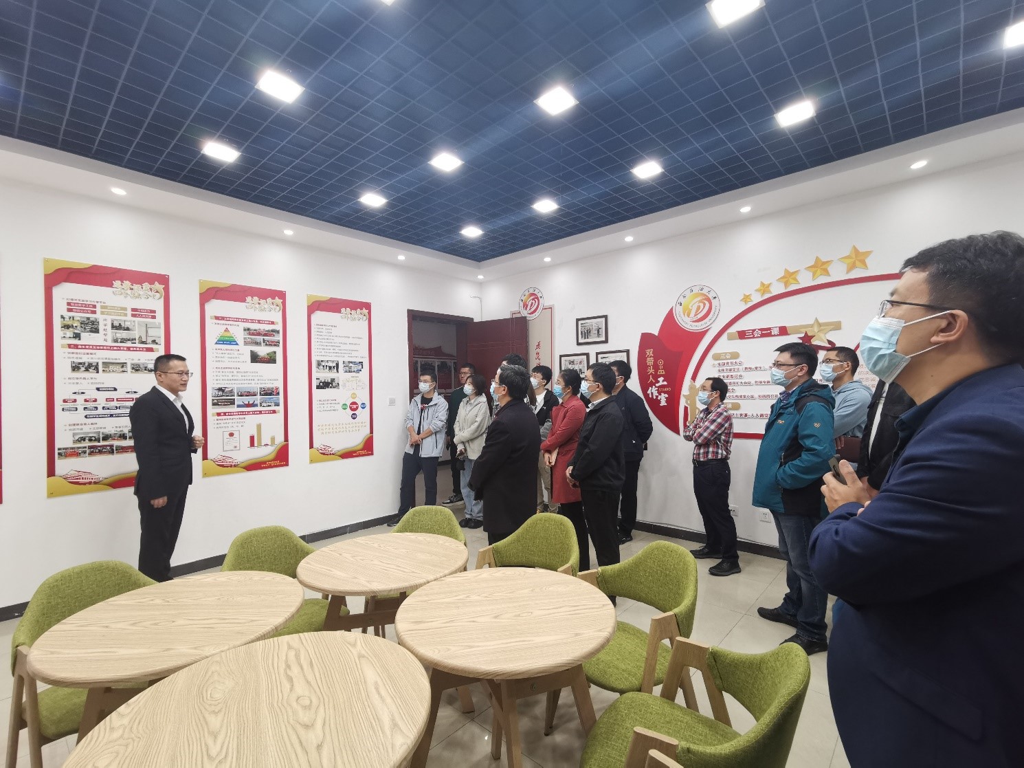 參觀中,朱紅鈞向大家全面介紹了工作室內外墻展板以及室內布局,回顧了海洋油氣工程的發展歷程,分享了支部建設的相關經驗。他指出,將學生納入教師黨支部一起開展工作,有利于更好地培養學生黨員,起到相互監督的作用。工作室將黨建、教學、科研融為一體,積極開展“三會一課”。同時,教師黨員既要指導學生學術,也要注重思政教育的開展,從思想、品德、行為上做出表率,通過黨團共建等形式,在文化上、業務上融入黨建,全面推進教學科研、人才培養等工作,增進師生間的協作與支部凝聚力。