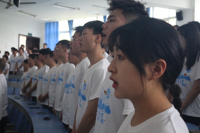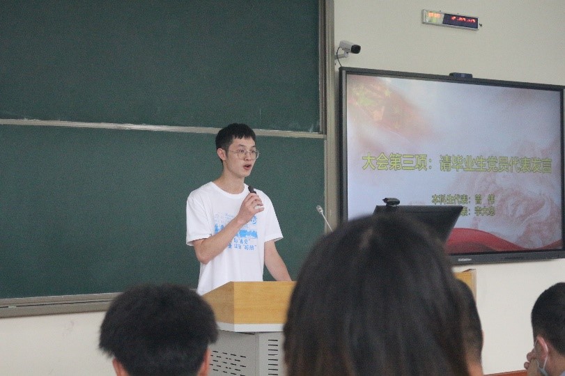 在悠揚舒緩的院歌《初見》歌聲中,大會開幕。在場師生全體起立,奏唱《國歌》,激昂磅礴的歌聲響徹整個會場。在李老師介紹完所有參會領(lǐng)導(dǎo)和嘉賓后,畢業(yè)生黨員代表進行發(fā)言。本科生代表曾偉和研究生代表李大忠的發(fā)言中均表達(dá)了自己對黨、對母校、對老師和同學(xué)深深的感激之情,并表示今后踏入社會定會牢記自己的黨員身份,強化自身黨員責(zé)任意識,為黨和國家的建設(shè)與發(fā)展貢獻(xiàn)力量,為母校增光添彩。