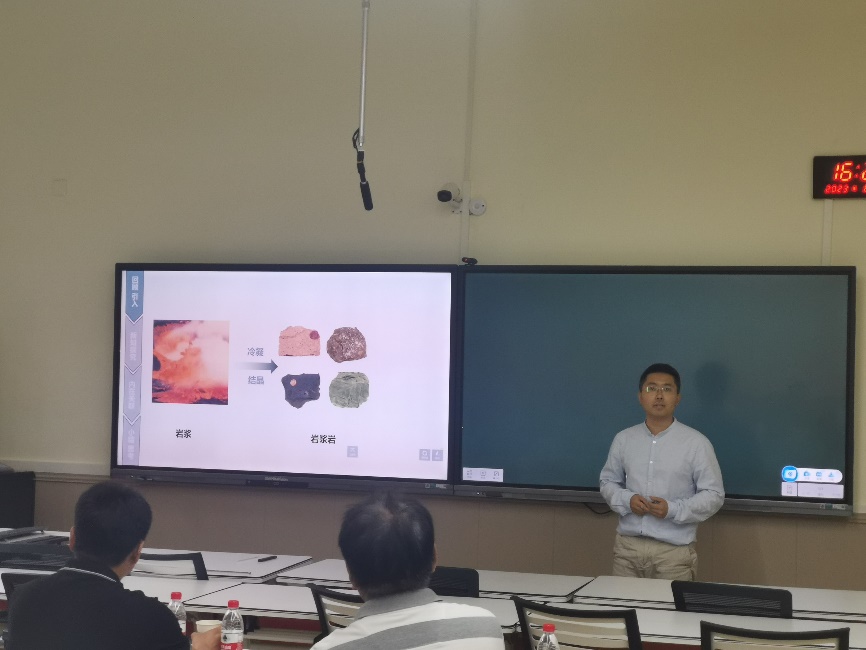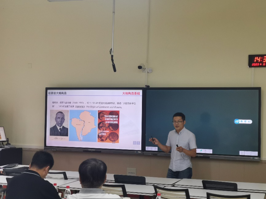 比賽伊始,地科院院長黃旭日作賽前動員,介紹了青年教師課堂教學競賽組織的背景和意義,結合專業教學實踐,強調思政教學內容的引入、提煉,要注重體現專業特色、社會現勢性。