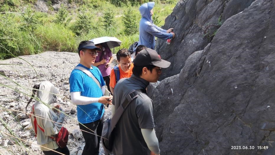 6月28日下午,實(shí)習(xí)隊(duì)教師一行來到峨眉山市羅目鎮(zhèn)魚田壩開展教學(xué)研討工作,重點(diǎn)考察中三疊統(tǒng)雷口坡組。王興志老師系統(tǒng)的給中青年教師講解雷口坡組的沉積環(huán)境、巖石組合和各種典型沉積結(jié)構(gòu)構(gòu)造。雷口坡組記錄了多個(gè)完整連續(xù)的海侵-海退旋回,各種沉積結(jié)構(gòu)和構(gòu)造十分典型,如干裂、雨痕、同生角礫、膏溶角礫、藻疊層、網(wǎng)格狀節(jié)理等。