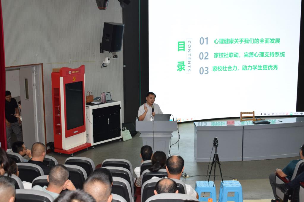 會上,方可老師著重分析了為什么心理健康關乎我們的全面發展。他解釋到:“現在評價一個孩子的標準不只是成績好不好,而是文化素養、專業素養、道德素養等綜合的一個評價”。他根據以往統計數據,結合自己專業的知識,為各位家長理性分析其本質。他指出,家長應積極關注學生心理狀況,學校也會為學生提供積極的心理咨詢與發展性心理教育,若學生有心理問題需送往專業醫院治療,加強家校社點線面聯動,完善學生心理支持系統。方可老師在與家長互動過程中希望每位新生家長重新認知自己的成長經歷,做一位開明的家長、會溝通的家長。