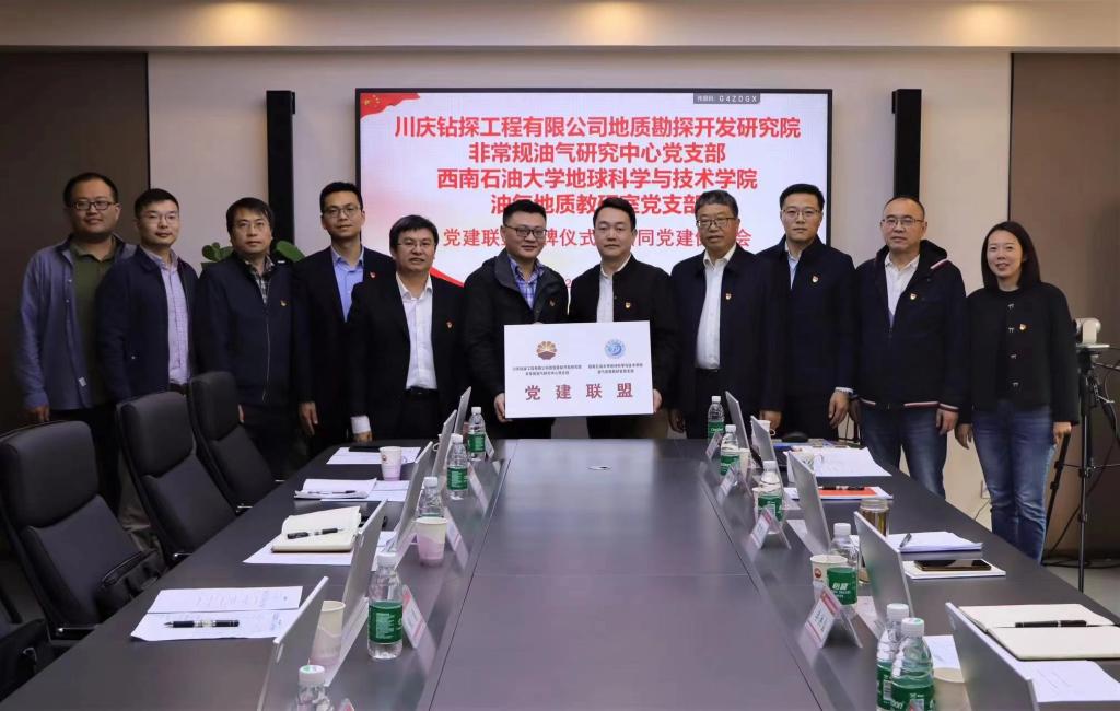 我院油氣地質教研室黨支部積極探索新時代基層黨支部建設,在學院黨委領導指導下、川慶地研院黨委領導大力支持下,油氣地質教研室黨支部與地研院非常規油氣研究中心黨支部進行多次深入交流,最終確立開展共建合作、建立黨建聯盟,并于2023年11月10日在川慶地研院隆重舉行了“黨建聯盟掛牌儀式暨共同黨建促進會”。