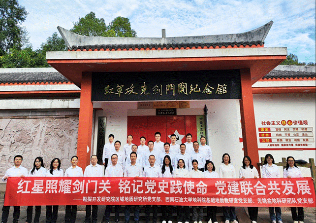 考察結束后,校企共同前往劍閣劍門關,瞻仰紅軍攻克劍門關紀念館。在館內,大家緬懷了黨的光輝歷程,并達成了協議,結成共建支部,決心通過黨建促業務發展,共同開展油氣能源地質勘探方面的基礎研究、油氣勘探方面的業務探討和交流。在紀念館的莊嚴氛圍中,大家共同宣誓,重溫了入黨誓詞。