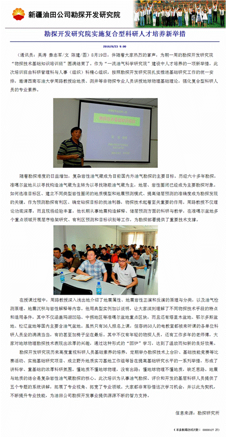 新疆油田勘探開發研究院出于培養復合型科研人才,加強非物探專業技術人員對物探相關基礎知識的了解與學習,提升綜合研究水平的愿望,特邀請我院周路教授在克拉瑪依市新疆油田勘探開發研究院結合準噶爾盆地具體實例針對非物探專業技術人員舉辦為期一周(2016年8月15日—2016年8月19日)的物探技術培訓班。周路教授在五個半天的講課時間內分為5個專題圍繞地震巖性解釋、儲層預測與油氣檢測等基礎知識,并結合準噶爾盆地具體實例、地震地質結合案例進行講解,參加培訓人員為油田勘探開發研究院各個研究所相關人員達50余人,培訓效果受到了各位學員的普遍好評,創研究院培訓參加人數多、堅持時間長的記錄,堂堂課參加人數爆滿,許多學員都是在繁忙的科研和生產研究任務中擠出時間堅持參加聽課!油田研究院對該次培訓非常重視,專門做了培訓宣傳和相關通知,事后對培訓效果也進行了問卷調查(見圖1),油田網站上先后三次做了相關新聞報道(圖2)。周路教授該暑假還應新疆油田采氣一廠的邀請也進行了專題講座。
