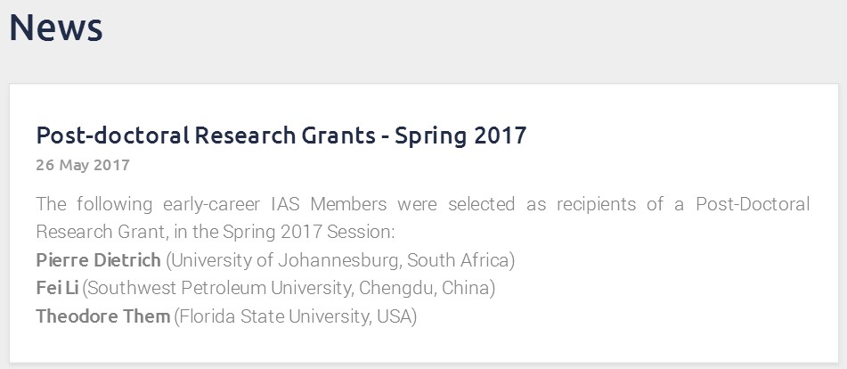 我院青年教師李飛博士獲得國際沉積學家協會(IAS)2017年度研究基金