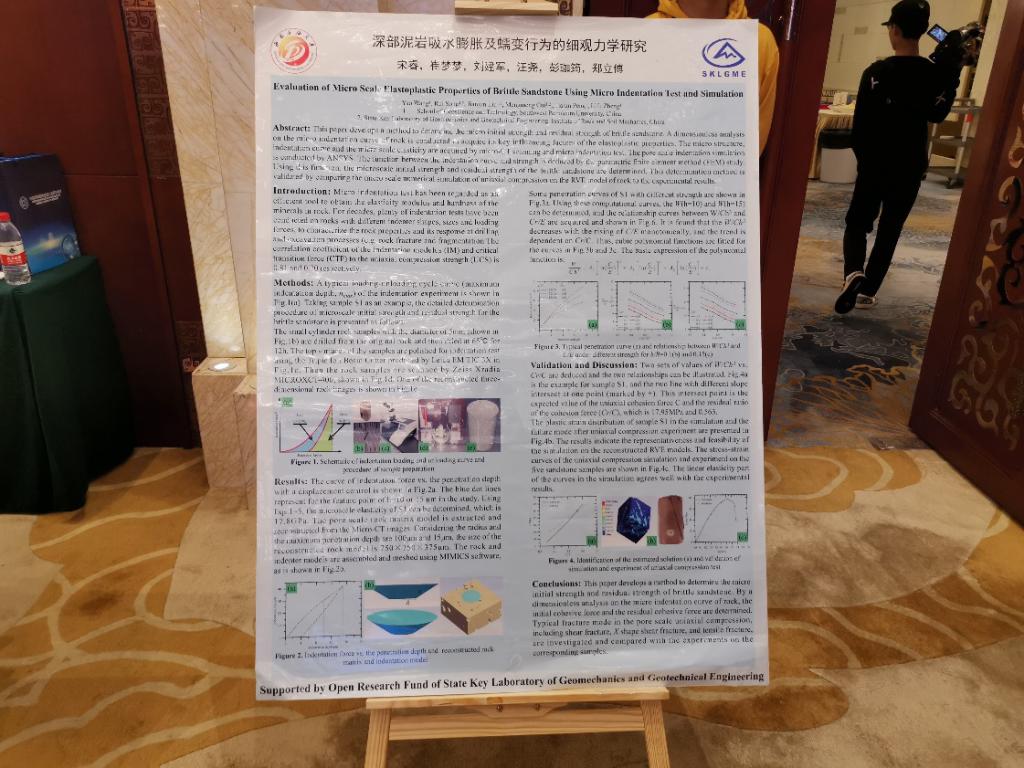 我院博士研究生汪堯參加了本次會議,并在地質力學與巖土工程青年論壇進行了題為“Evaluation of Micro-scale Elastoplastic Properties of Brittle Sandstone Using Micro Indentation Test and Simulation”的海報展示,與相關領域的學者進行了深入探討。通過此次會議,展示了地科學子的風采,也學到了前沿的專業知識,將促進我院學生不斷向前奮進。(圖/文 汪 堯 李雅雯)